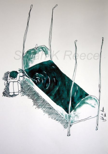 Are a common symptom of Posttraumatic Stress Disorder (PTSD). In my case, it was hoped I would grow out of them. I haven’t, they are something I live with. I go through phases where they are comparatively benign, and others where they are so severe I can’t, and don’t want to, sleep. At the moment, I’m going through a bad phase. I painted this ink picture the other day. This is how it feels.