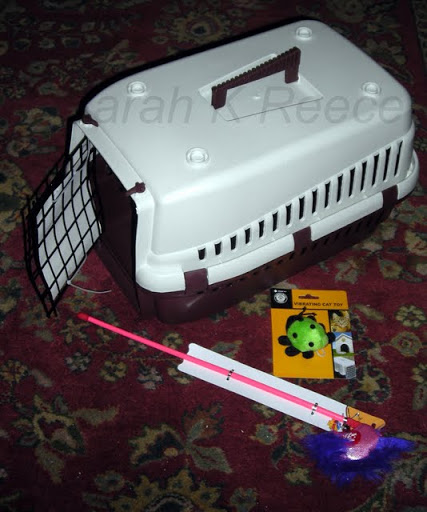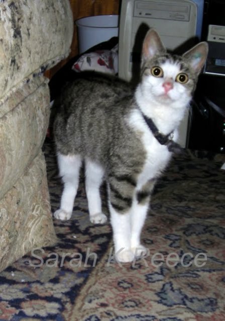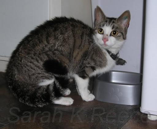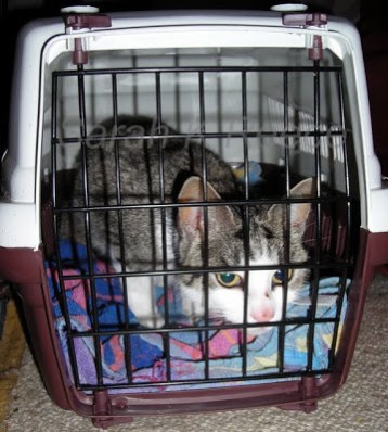 She’s painfully thin and was very excited about dinner. Shivering with nervous energy she’s thoroughly explored the house from top to bottom – the rooms I’ll allow her in. Ever minute or two she comes back to me to wrap herself purring around my legs, then disappears to explore somewhere else. I’d forgotten how much cats like hidey holes! She has found the gap under the computer desk, the space beneath the couch, under the dining room dresser, behind the microwave, behind the washing machine, and, well, you get the picture!