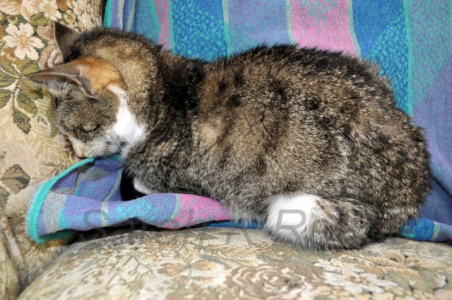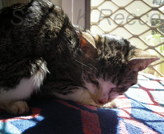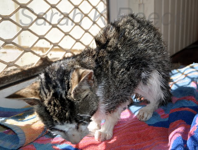 I sat with her in her favourite sunny spot by the back door and dried her off with the hair dryer. She hated all of it but is too tired to fight. It takes about an hour from start to finish to clean and dry her, and at the moment she needs this twice day. Here she is at last, clean and dry and resting: