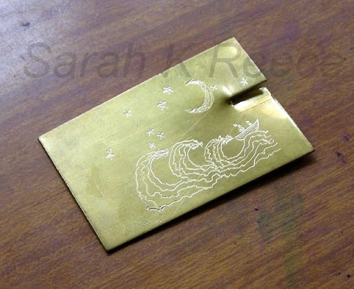 I’ve been experimenting with different surfaces to see what I like the best. The hammered surface is really lovely, it has a handmade feel which is much more my style. I also had a play with an engraver for the first time, and fell in love with it! Here’s my first try, a tiny sea scape: