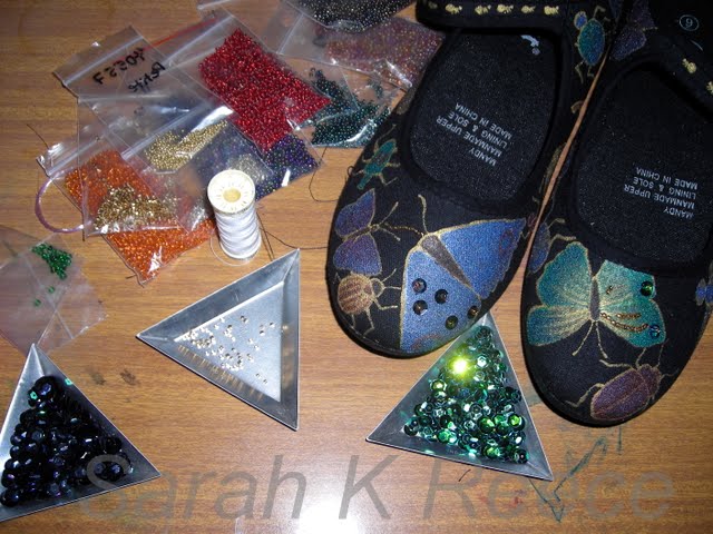 I’ve finished my second pair of painted shoes tonight! These ones have a few beads and sequins added for a little extra sparkle. I must get a thimble, I have holes in my finger tips from pushing the beading needle through the heavy shoe canvas.