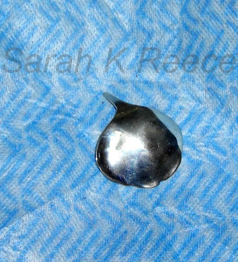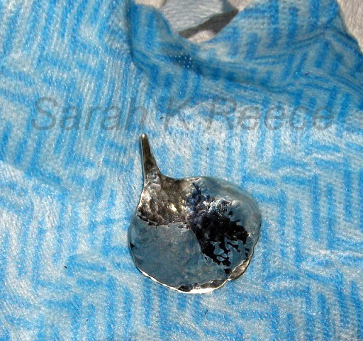Here it is: a rose petal in silver. The long ‘tail’ on it will be pulled to the back in a curl, the chain will go through that loop to suspend it. The surface has been polished and then hammered to give it that lovely ripple effect – I think it looks like light catching ripples on water. One edge has been curled down and the other curled up, and a little fluted to give it a natural look.