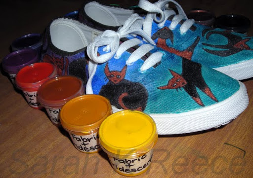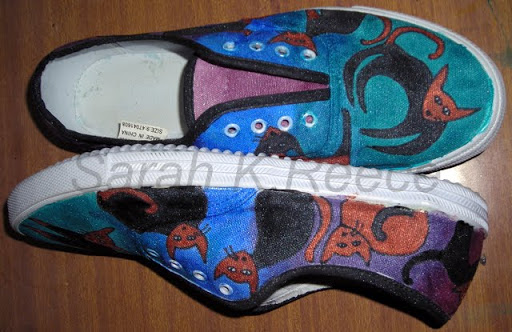 Today, I got back to my shoes – did some humming and aahing about what colour to paint my cats on these… silver and black? yellow and orange? decided in the end on bronze and black, nice contrast to the teal without being garish. Aren’t they gorgeous! I love them!