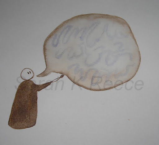 I’m really pleased with the effect, the blending technique I learned from a Chinese style of ink painting, which uses two brushes at the same time – one to load strong colour onto the paper, and the other to blend it softly. The sepia tone is ink, and the colours are Chinese paints layered on top once the ink has dried. This one is about how creative outlets such as art and writing can help to give you a voice: