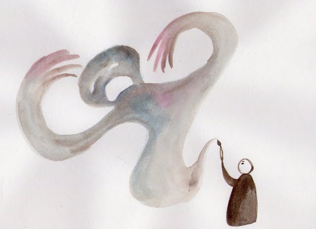 I purchased the paints very cheaply while in Singapore last year, and have designs on some more for Christmas this year. I used these together with the sepia ink for the first time recently to paint the illustrations for a talk about creativity and mental health. They are gorgeous, a little more opaque than western watercolours with lovely soft blending. These paintings are done entirely in the sepia ink, dried, and then the Chinese paints are painted on top to add gentle areas of colour.