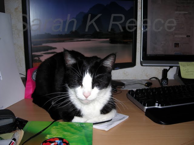 Both eyes are almost completely clear now and she’s much happier in general. Here she is keeping me company while I blog:
