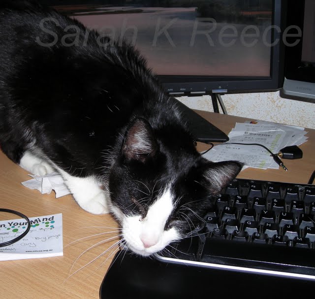 Hurrah, apart from being a bit sniffly when the pollen is bad here, Cleo is improving day by day. Here she is, taking over my keyboard: