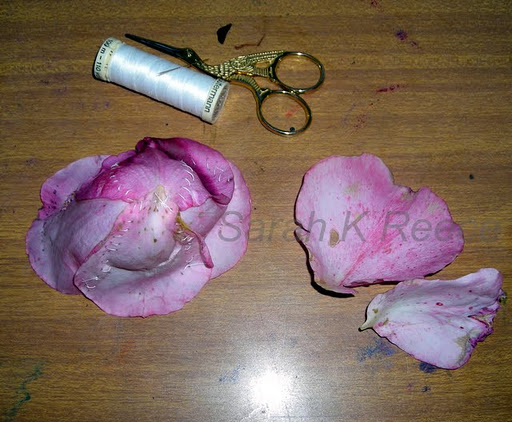 Fresh rose petals from my garden, plus a fine needle and white cotton thread: