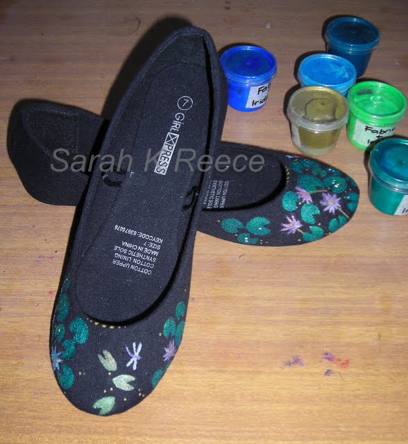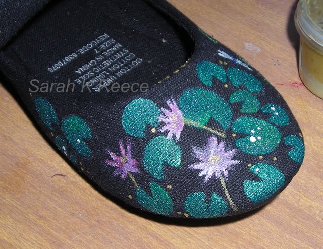 I’ve been painting a new pair of shoes, this time inspired by the lily ponds at the Singapore Botanic Gardens. I was there for three months at the start of 2011, so I had some great photos to refer to.
