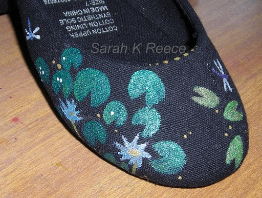 I’ve been painting a new pair of shoes, this time inspired by the lily ponds at the Singapore Botanic Gardens. I was there for three months at the start of 2011, so I had some great photos to refer to.