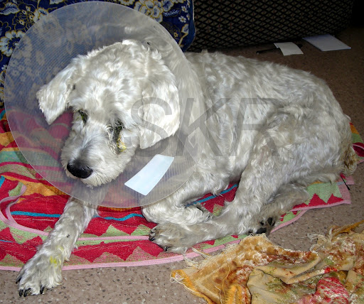 I took him to the vet today and he came home sporting this terribly fashionable short collar. When I last had him at the vet I was told to return once his condition had started to improve for blood tests – there wasn’t much point in taking any when he was so terribly unwell with the infected feet etc. The vet also cautioned me that if his tears start to seem milky it may be an eye infection and I’d need to return. I’ve been concerned about his eyes and tears and giving them baths in warm salty water but over the weekend they seemed to get a lot worse so I took him into the vet today.