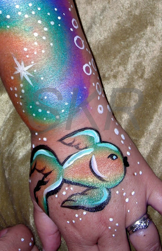 So I’ve been having a ball learning how my new products work and how much water to use to activate the cakes. I’m stoked by the pearl colours, they’ll give me a great deal more versatility in my designs and the new glitter is a puff glitter – there’s no glue in it, it sticks to the wet paint directly instead. That means less ‘paint’ feel on the skin, and as a bonus the glitter takes on the colour of the paint beneath it, which is awesome! Here’s some designs I painted quickly today: