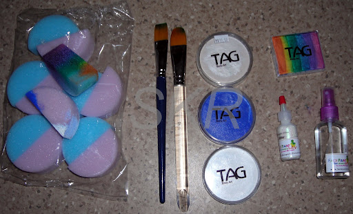 I’ve been doing quite a bit of research online about the next brand of facepaint that would suit my circumstances best and is available locally. It’s a pain if you have a few parties in a week and run out of a colour part way through and have to order a replacement from overseas. I was very happy with the reviews for TAG, particularly the quality of the pearl/metallic colours (whee!) and the way it handles in hot weather. It is also available locally at Kool 4 Kats on Unley Rd. I read through all the products online and worked out my wishlist to make me keep to a budget in store. Then I went in on Friday and the owner kindly demonstrated some of the products for me! So, this is what I came home with: