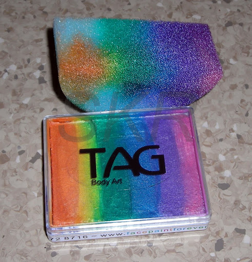 The other thing that really excites me about the professional quality cakes is the split cakes – where more than one colour is put in the same cake. This makes it really easy to load several colours at once onto a sponge or brush. Speed is of the essence when your canvas wriggles about! I would previously get a rainbow by painting all of the rainbow colours one by one onto my sponge. Now I can gently wipe my sponge across my new rainbow cake and viola!
