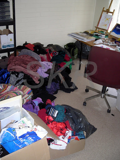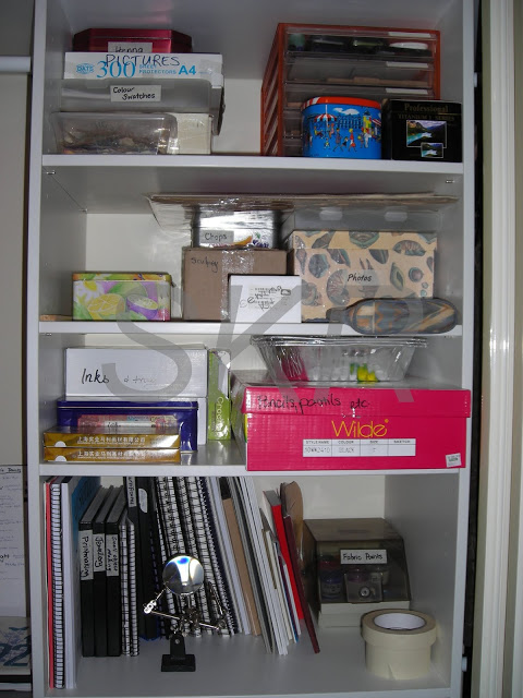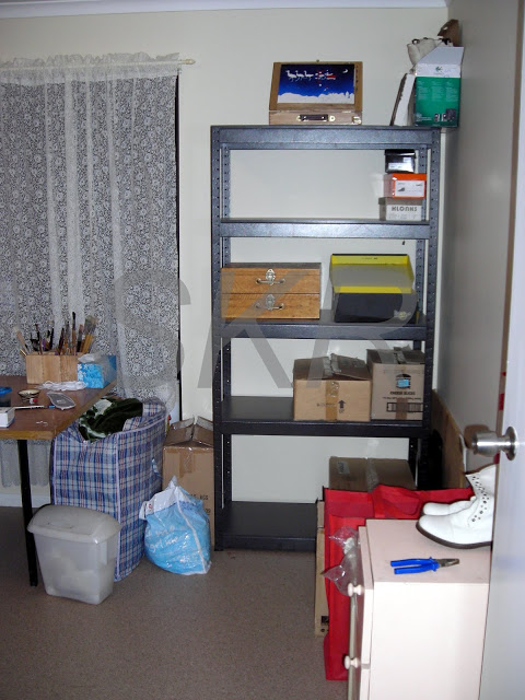 I’ve been taking advantage of the easter holiday to work on my studio area. I’ve been struggling a bit lately with nightmares and rashes and whatnot and I’ve figured out that one of the problems is that my studio area has been totally neglected lately and has become a dumping ground for boxes that I’ve moved out of the rest of the house. By Thursday last week I was losing it a bit so I decided to have a holiday at home this long weekend and I’ve ignored all my email and not picked up the phone for the duration. It has been good to have some uninterrupted time to focus! There’s always an awkward transition period for me in the immediate aftermath of being incredibly busy when suddenly I don’t have all these huge projects occupying my brain and everything I’ve been ignoring wells up and threatens to capsize me. Busy suits me a lot, my brain is like a big dog that needs a lot of exercise else it gets bored and restless and starts chewing on the furniture and digging under the house.So, in my usual obsessive way, I’ve been face painting (more pictures later), thinking, writing, crying, and sorting out the house. Occasionally I remember to eat. My sleep patterns have reverted to my ‘normal’ which is waking hours between noon to 3am. That’s going to hurt when Tafe starts up again. But, it’s been needed! Here is what my studio looked like a couple of days ago: