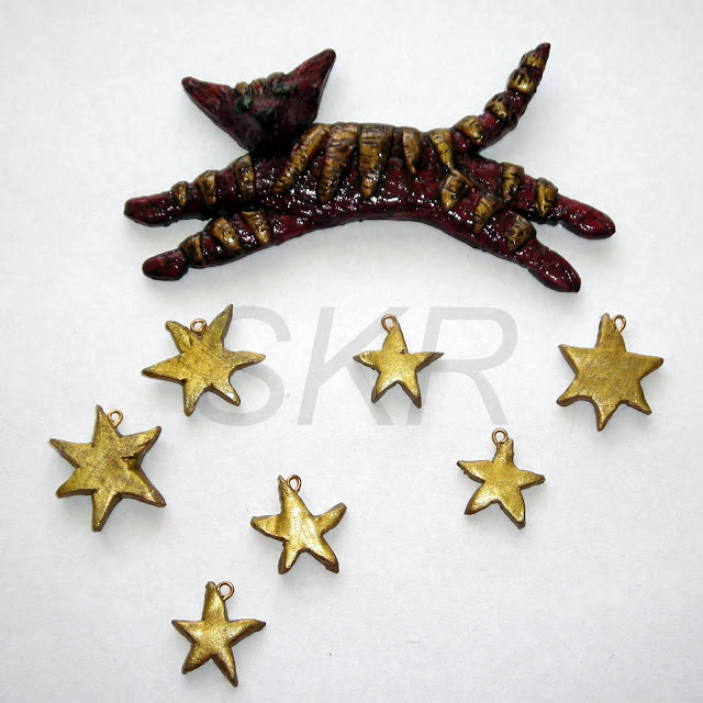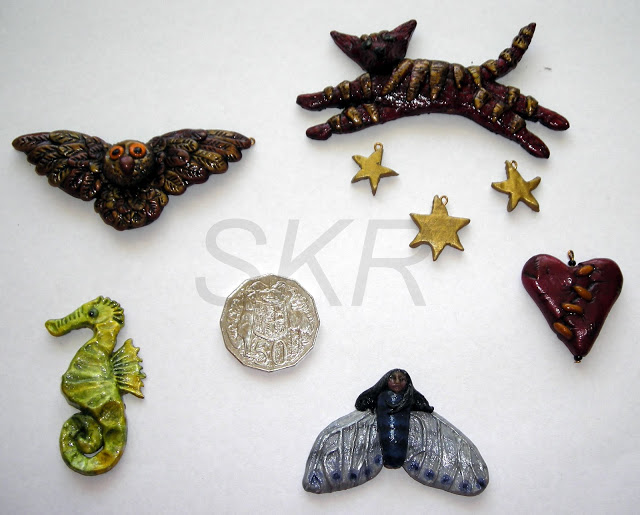 I’ve love working with polymer clay. The product is frankly revolutionary, it is soft to work and holds very fine marks, but bakes and sets as a hard plastic in an ordinary oven. It is very light too which means even large pendants wont drag on your neck or large earrings wont hurt to wear. PMC can be horribly expensive to get into, and for people like who fatigue quickly and have issues with joint pain, some varieties are just too firm to easily work with. I get around these issues by using only a single colour of soft PMC called Super Sculpey. I then get out my fine brushes and paint the fired pendants by hand, which I love doing. Modelling is incredibly enjoyable, sculpture on a tiny scale which is perfect for my circumstances.