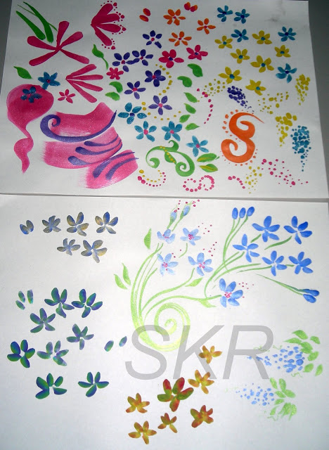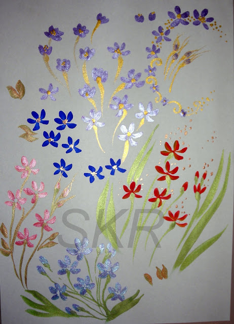 I’d been practising my face painting techniques with flowers, and started to design my own sprays of wild flowers. Flowers are a good design to be able to do quickly and consistently well as they are often used to fill in or outline more complex designs such as masks. I’m really happy with my technique here, I can paint these very quickly and I think the sprays are lovely. As you can see I’ve been continuing to add to the range of colours in my kit, there’s now a really good selection of pearl/metallic colours, all of which I’ve converted to split cakes so I can get really beautiful two tone affects when I want to.