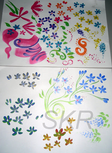 I’d been practising my face painting techniques with flowers, and started to design my own sprays of wild flowers. Flowers are a good design to be able to do quickly and consistently well as they are often used to fill in or outline more complex designs such as masks. I’m really happy with my technique here, I can paint these very quickly and I think the sprays are lovely. As you can see I’ve been continuing to add to the range of colours in my kit, there’s now a really good selection of pearl/metallic colours, all of which I’ve converted to split cakes so I can get really beautiful two tone affects when I want to.