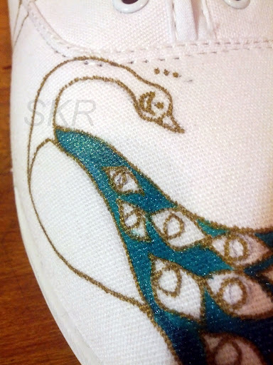 I’m back working on my list of art commissions and today I finally nailed down a design for the next pair of shoes. I’ve been given free reign to design anything I like and a swatch of material it needs to compliment. I decided on peacocks and a gold paint outline for a finer effect than my usual black. I treated myself to a small purchase at the art shop recently and bought some more Pearl Ex pigment colours. I’m using a metallic green pigment added to the paint to create a two-tone shimmer which is working beautifully. Very relaxed and content today, pottering and painting. Here’s a sneak peek of one of the shoes in progress, more photos coming soon! 🙂