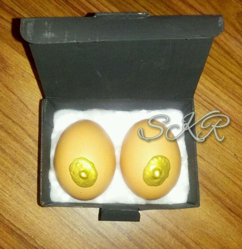 The second sculpture was playing with ideas around the sacred and taboo, particularly around our cultural reaction to the only food we make ourselves: breast milk. I used eggshells to represent new life, and turned them into breasts with the addition of sculpted polymer clay nipples. Blowing the eggs empty was fiddly and time consuming, I spent a lot of the last weekend with egg in my fringe. 🙂 I played with realistic colouring but decided to reference the use of gold leaf in art to signify the divine or sacred instead. The result has an unexpected element of humour to it, which I love. There’s also something a bit cheeky about the work, a slightly flippant take on a serious topic, a wink to fake breasts a la Monty Python, a nod to my own sexuality. Something that makes me smile: breasts in a box.