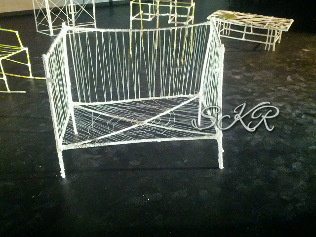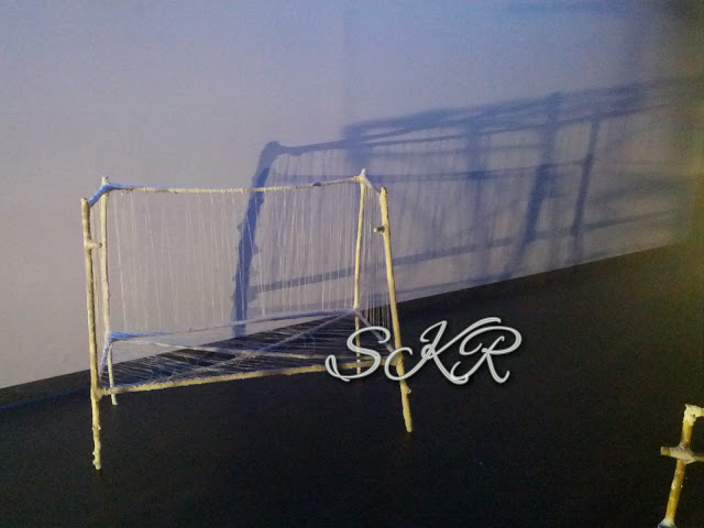 Here’s the finished cot: I laced string over the plastered bamboo to form the bars of the cot and added a double curl to the base. The word that kept coming to mind while I was creating it was heartstrings.