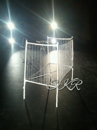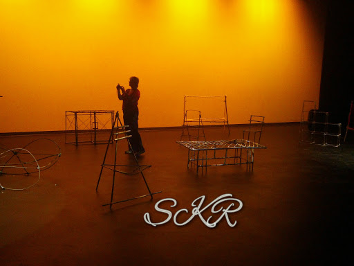 My sculpture class all finished our bamboo furniture projects recently, and set them up in an empty theatre at the college (I adore studying on a campus that is just a huge building dedicated to the creative arts)… to see how they looked when lighted. Pretty awesome is the answer.