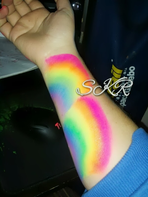 Here’s the culprit! A neon rainbow split cake. This (for those who care) is a DFX rather than my usually preferred TAG, for the simple reason that it is a proper six colour rainbow in the correct order – which is oddly rare in the world of facepainting split cakes. Weird!