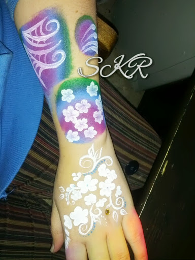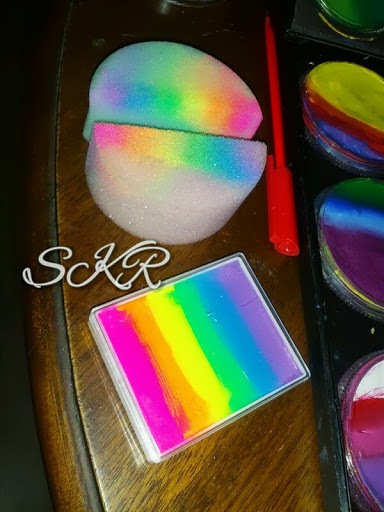 Here’s the culprit! A neon rainbow split cake. This (for those who care) is a DFX rather than my usually preferred TAG, for the simple reason that it is a proper six colour rainbow in the correct order – which is oddly rare in the world of facepainting split cakes. Weird!