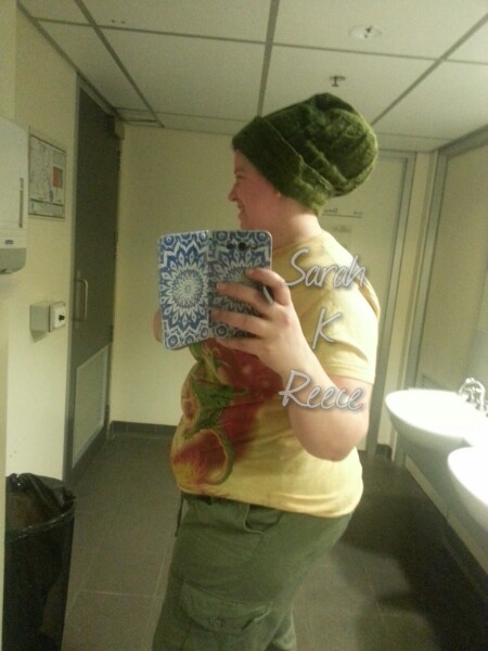 Took this photo in the bathroom at college today when I realised I looked like a green haired Marge Simpson… I’ve been working on a lathe and other equipment where dangling hair could get me scalped, so I put my dreads up them covered them with this gorgeous yak wool beanie from Nepal. When I put my dreads right up on the top of my head like this, I’ve got quite a bit of height going on!