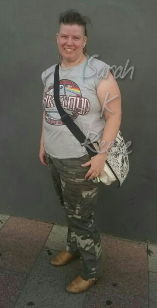 Whoo hoo! I have quite the bump now, but have found that when I dress like this (the pants are about 3 sizes too big) it disguises it well and I look alternative/stroppy enough with my head sides shaved that random people don’t touch my tummy. This is making me very happy! I hadn’t realised how quickly the touching issue was stressing me, so I’m wearing bump revealing things at home or with friends where I can feel all rotund and earth motherly in peace, and clothes that hint I might tear off sometimes arms if they touch without permission in public, and I’m feeling so much more relaxed. 🙂