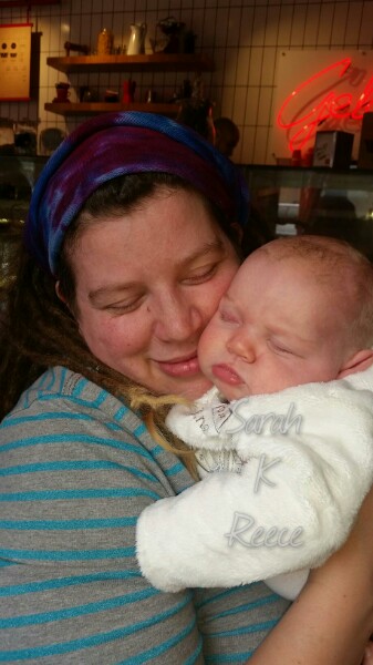 Poppy was being adorably cuddly today – she’s graduated from physio for her tongue tie and is now feeding well and putting on excellent weight. Rose snapped this photo of us having a cuddle while hiding from the hail in a cafe. ❤