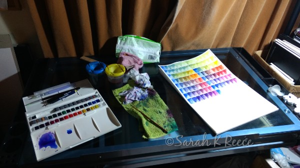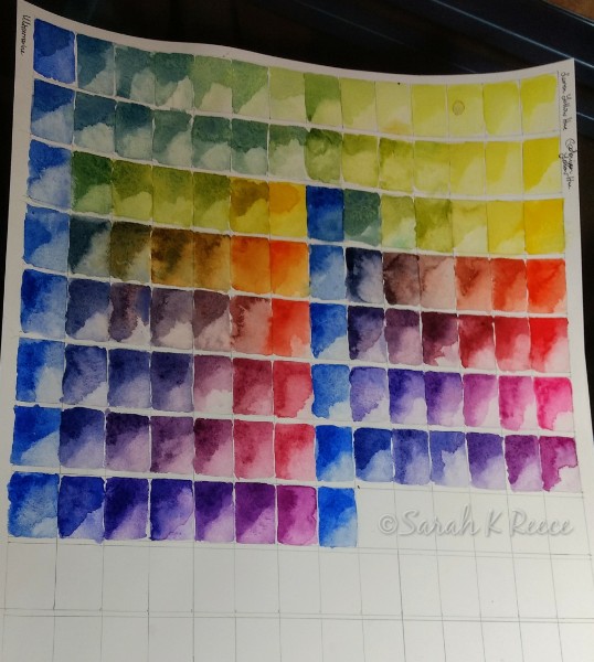 I have a new lovely set of watercolour paints, and I’m creating a number of charts to learn how the colours handle and mix. This one is Ultramarine Blue, being mixed with every other color in the set of 45. I prefer inks to watercolours, they are even less forgiving and more vibrant, but it’s still a medium I enjoy. I took a class recently and painted some chickens. The light to dark sequence of paint application was a bit mind bending after doing so much oil painting which is often the reverse, but pushing the limits of my technical skills is great fun. There’s something quite joyful and meditative about colour charts.