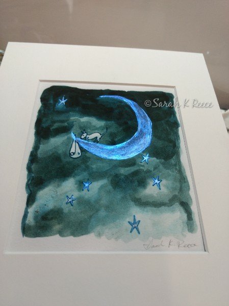 It’s rather like moonstone, appearing milky white from one angle and flashing intense blue from another. Against a white background it’s almost invisible until it flashes blue, which reminds me of the artworks I’ve created with invisible UV reactive ink. It may even work as a way to embellish prints made from originals with UV inks, I’ll have to trial it and see.