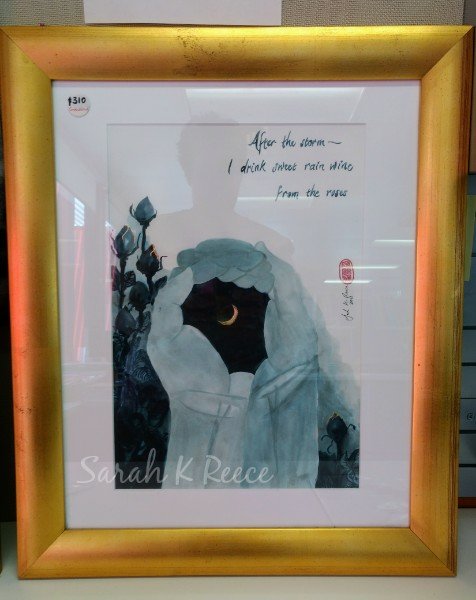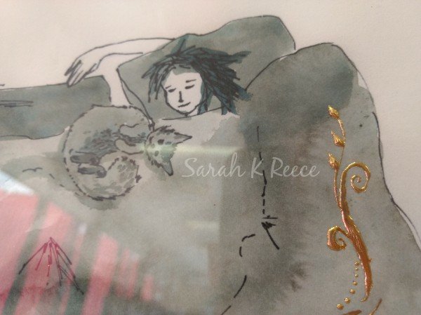 Digital print reproduction of my original ink painting, hand embellished with 24k gold. Framed in 12×16 inch, black.