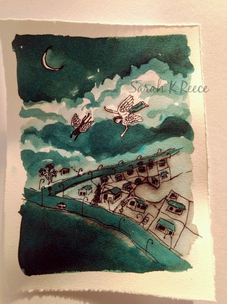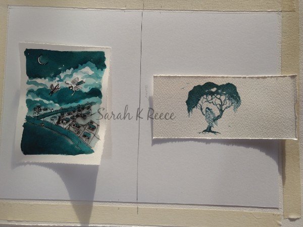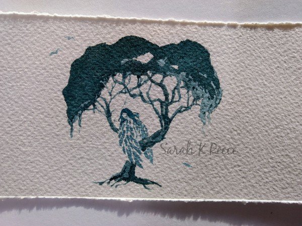 So I have been hoping to blend a similar colour with my watercolor paints, that keep forever between uses. Today I achieved that with a mix of Quinacridone Red and Phthalocyanine Turquoise. I tested it by making two tiny artworks. This one is in inks, with outlines using a dip pen with black ink: