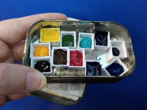 Today I was well enough to go into my studio and play. Among other things, I’ve now set up my travel watercolour kit with my favourite colours (mainly Sennelier with a Qor and a couple of Winsor and Newton).
