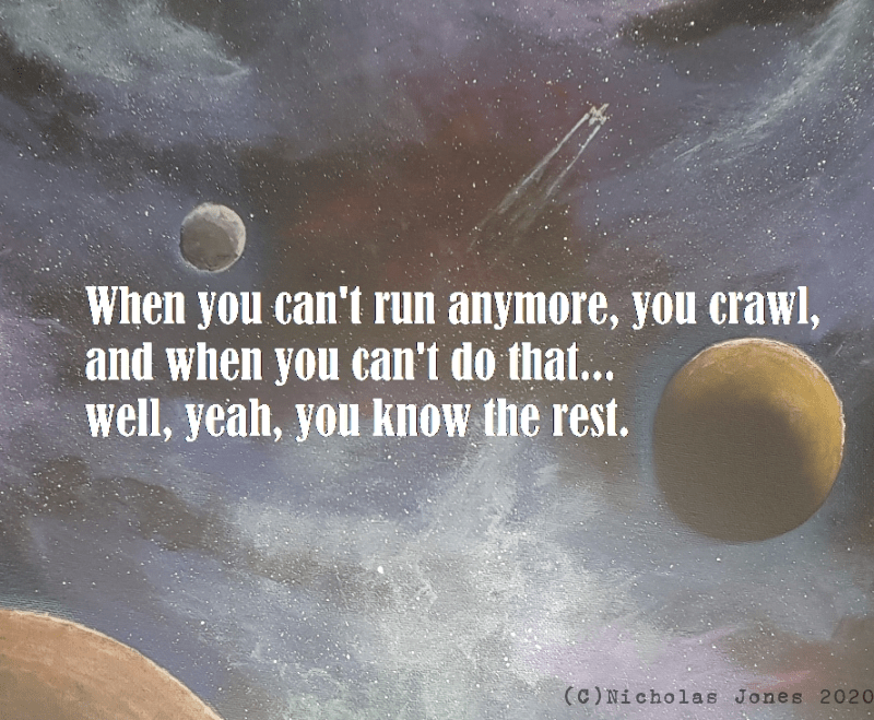 Image description: artwork depicting space with planets, nebulae, and a tiny spaceship in the distance. White text overlay of a wrote from the Firefly series “When you can’t run anymore, you crawl, and when you can’t do that… well, yeah, you know the rest.” In the series the final line not mentioned here is “you find someone to carry you”.