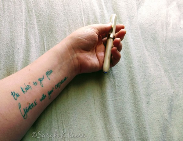 Substituting the need was my best approach. Less instant and complete, I learned to be patient with the alternatives and put up with partly met needs. It was by far the best relief I’d found. I developed Ink not Blood and discovered in a strange way that I was equally ashamed of simulated self harm as I was of actual wounds. The shame was more about the visibility of my pain than it was about the taboo of self harm. I felt deeply embarrassed I needed such a thing. Wrist poems continued to weave their way through my life as an alternative too. Talking to myself on my skin.