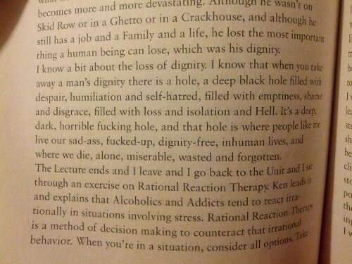 From James Frey’s A Million Little Pieces. Dignity and self hate and pain and mental illness… The self loathing that comes from being treated without dignity, and the lack of dignity that comes from making choices fuelled by self loathing. It’s a perfect spiral. Anyone with a diagnoses of Borderline Personality Disorder is probably intimately familiar with it.
