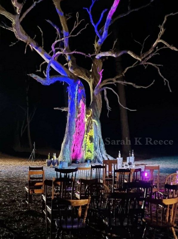 ID: A forest at night. In the foreground is a cluster of wooden chairs of various designs, arranged in rows facing a huge white dead tree. Pink, blue and yellow lights are cast upon the trunk, making it glow. Bottles of fairy lights are on tree stumps on either side.