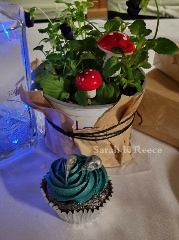 ID: Table decorations. A potted black violet in bloom worth a decorative red and white spotted mushroom. To the left is a gin bottle with blue fairy lights inside. To the right are booked wrapped in brown paper. In front is a chocolate cupcake in silver foil, with a swirl of teal icing and two silver chocolate bird skulls on top.