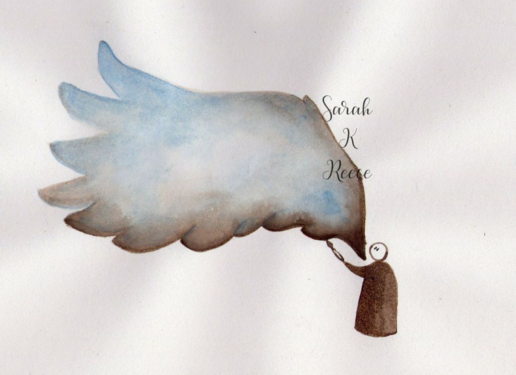 ID ink painting of a figure in brown with a paint brush, painting a large blue and brown wing from one their shoulders